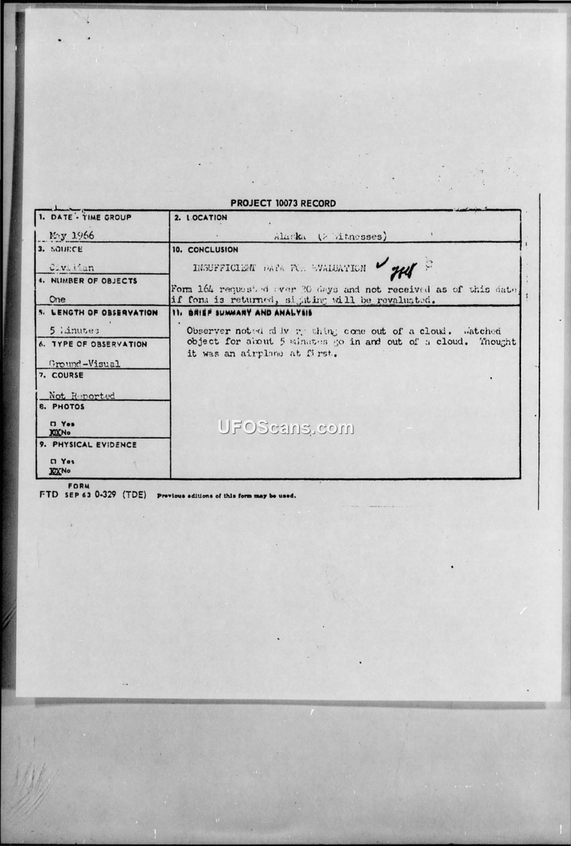 PROJECT 10073 RECORD — Alaska Sighting, May 1966