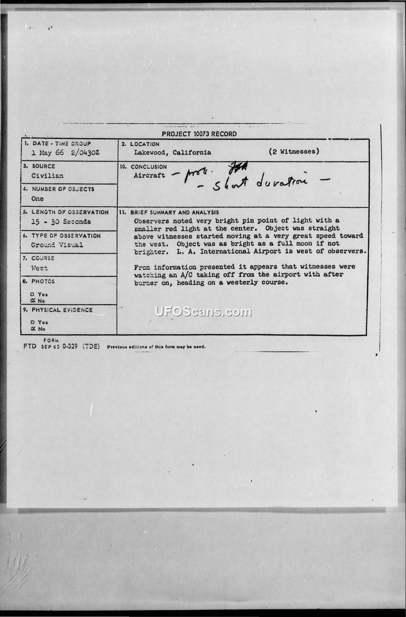 Project 10073 Record — Lakewood, California, 1 May 1966