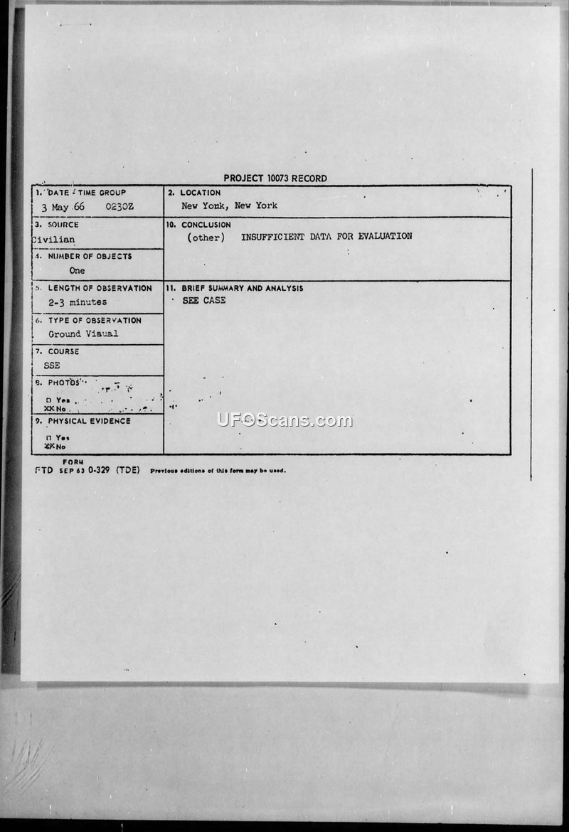 Project 10073 Record — Sighting in New York, New York, 3 May 1966