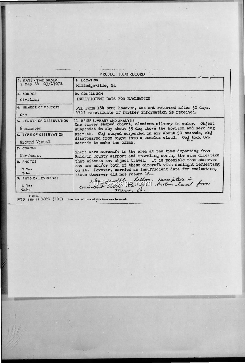 A civilian in Milledgeville, Georgia, reported a metallic, saucer-shaped object on May 3, 1966. The Air Force classified the case as having insufficient data for evaluation after the witness failed to return the required follow-up documentation.