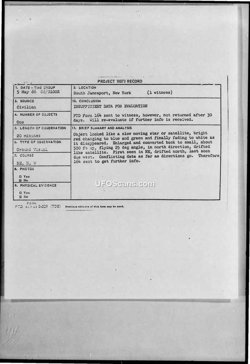 This document details a Project Blue Book investigation into a civilian sighting of an unidentified aerial phenomenon in South Jamesport, New York, on 5 May 1966. The witness, a builder described as sincere and well-educated, observed a single object for approximately 20 minutes. The object was described as appearing like a slow-moving star or satellite, which changed colors from bright red to blue and green, eventually fading to white before disappearing. The witness reported that the object appeared to enlarge and then shrink, flying at a 25-degree angle in a northerly direction. The witness also noted that the object appeared to have a smaller light forward of the main mass. The observation occurred under overcast, windy conditions, and the witness used binoculars to aid their viewing. Although the witness claimed at least six neighbors also saw the object, the Air Force's attempt to gather more detailed information via an FTD Form 164 was unsuccessful, as the form was never returned. Consequently, the official conclusion reached by Major Hector Quintanilla, Jr. was that there was insufficient data for a formal evaluation. The report also notes that an officer from a local base believed they saw the light, describing it as appearing to be a light plane with a white starboard or port landing light, though no sound was heard due to the wind.