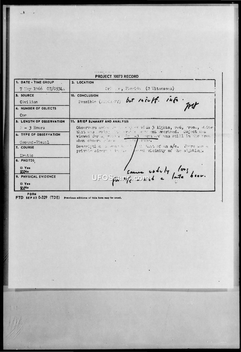Multiple sightings reported in the Orlando area in May 1966. Investigations by the 1360th Air Base Group found no unusual activity on radar or by local authorities. Some reports were attributed to birds or stars/planets, while others remained inconclusive due to lack of data.