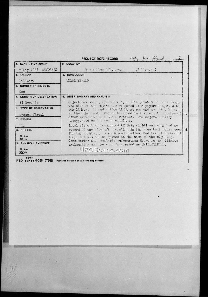 Project 10073 Record — Sighting of 7 May 1966, Goodfellow AFB, Texas