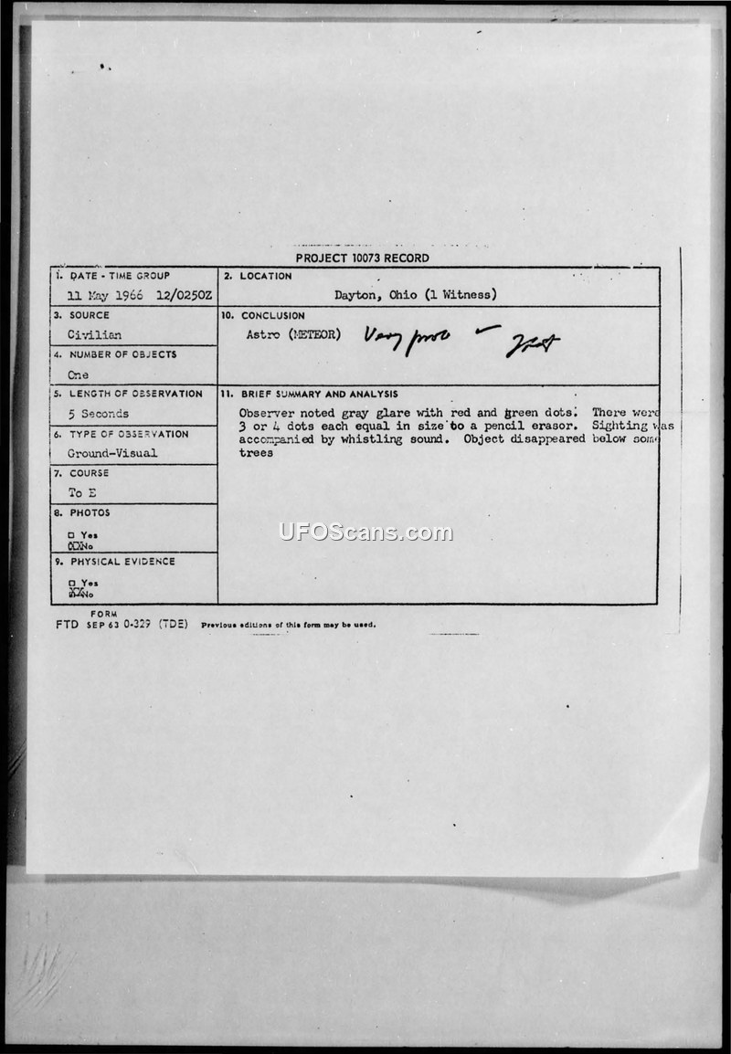Project 10073 Records: Multiple Sighting Reports, Dayton, Ohio, May 1966