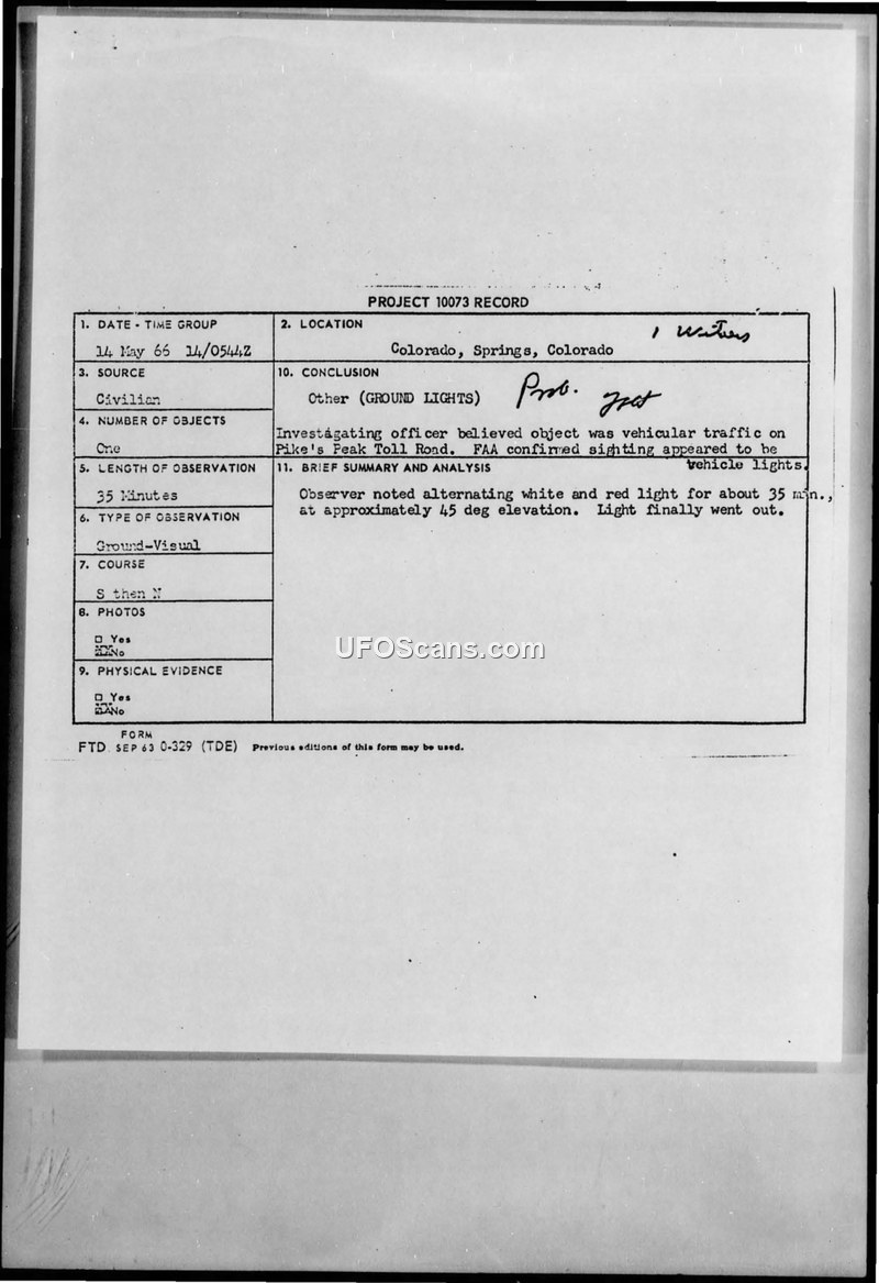 Project 10073 Record — Sighting Report, 14 May 1966, Colorado Springs, Colorado