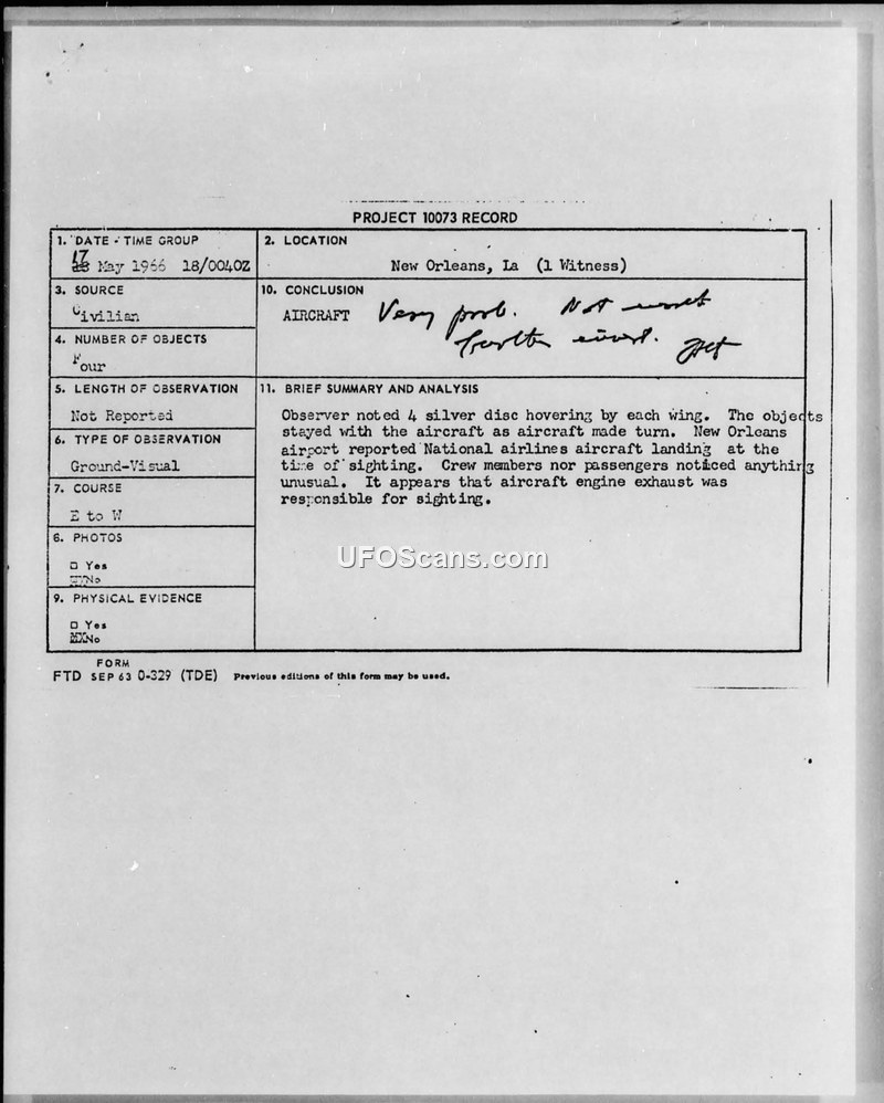 On May 17, 1966, at approximately 0040Z, a civilian witness in Arabi, Louisiana, reported observing four silver, disc-shaped objects while watching an aircraft flying from east to west. The witness, identified as an electronics engineer for the Boeing Space Division, stated that the objects were hovering near the wing tips of the aircraft and remained with it as it made a turn, eventually dropping out of sight. The report was initially received by Special Agent Lewis H. White of the Office of Special Investigations (OIS) at the Federal Building in New Orleans. Following the report, Captain Samuel P. Wheate of the Keesler Air Force Base Operations Services Division conducted an inquiry. He contacted the New Orleans airport and confirmed that a National Airlines flight from Mobile to New Orleans was landing at the time of the sighting. However, inquiries with the flight crew and passengers revealed that no one on board had noticed anything unusual. The official Air Force conclusion for the incident was that the objects were likely aircraft engine exhaust condensate. This conclusion was contested by the observer, who maintained that the objects were positioned off the wing tips rather than behind the wing, where exhaust condensate would typically be expected to appear. The documentation consists of a Project 10073 record form and a series of incoming staff messages from the Department of the Air Force, detailing the incident and the subsequent investigation.