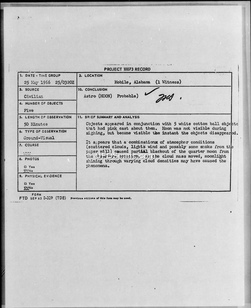 On 25 May 1966, at approximately 0320Z, a civilian witness in Mobile, Alabama, reported observing five objects in the sky for a duration of 50 minutes. The witness, described as a reliable housewife, observed the objects from the front yard of her home. She described the objects as flat, saucer-like, and yellowish-white in color, appearing to be the size of a penny held at arm's length. The objects reportedly remained in close proximity to one another, occasionally shifting from a horizontal to a vertical position, and appeared to move instantaneously. The witness also noted that these objects appeared in conjunction with five white 'cotton ball' objects that had a pink cast. The moon was not visible during the sighting but became visible the instant the objects disappeared. The Air Force investigation concluded that the phenomena were likely caused by a combination of atmospheric conditions, specifically scattered clouds, light winds, and smoke from a local paper mill, which caused a partial blackout of the quarter moon. As the cloud mass moved, the moonlight shining through varying cloud densities likely created the visual effect reported by the witness. The report notes that the witness had reported a similar sighting in the same location approximately one year prior.