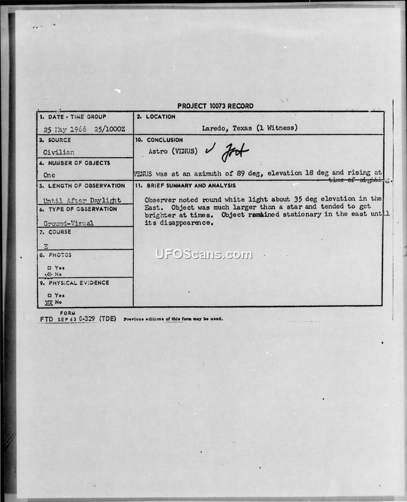 Project 10073 Record — Laredo, Texas, 25 May 1966