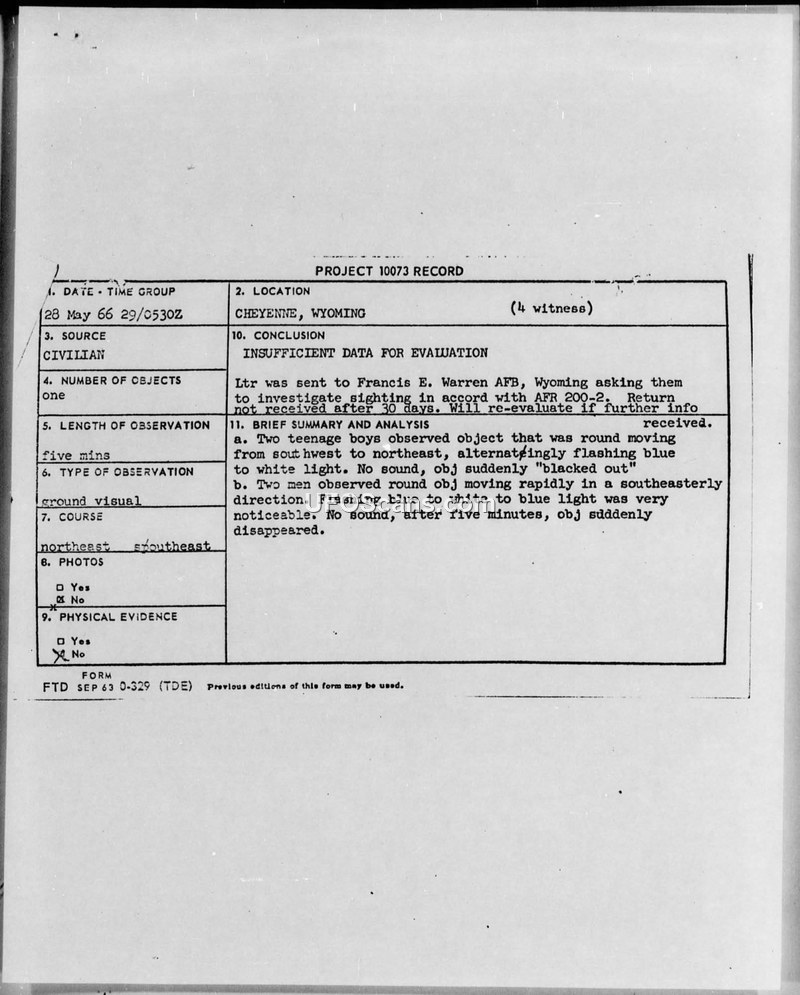 Project 10073 Record: Unidentified Flying Objects (UFO) Sighting, Cheyenne, Wyoming, 28 May 1966
