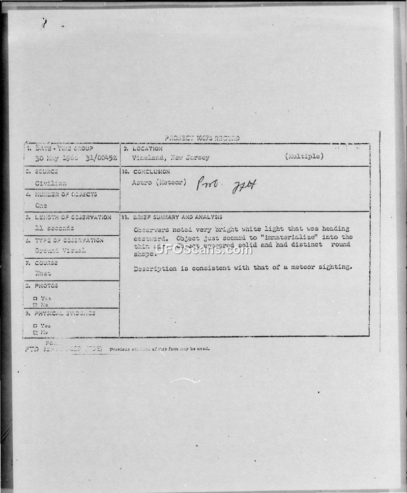 Project 10073 Record — Vineland, New Jersey, 30 May 1966