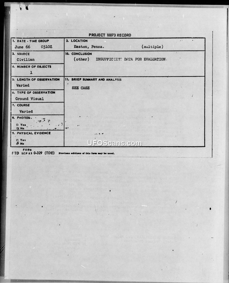 Project Blue Book Correspondence — Easton, Pennsylvania Sighting, June 1966