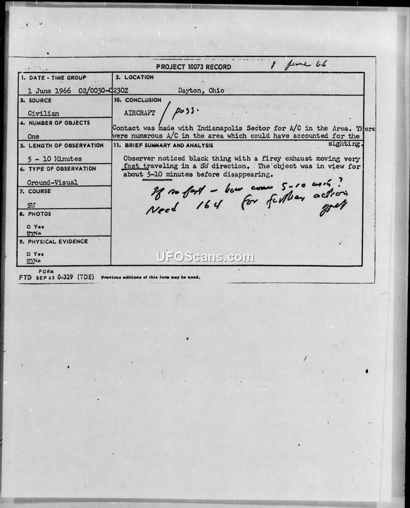 Project 10073 Records - Dayton, Ohio Sightings (June 1966)