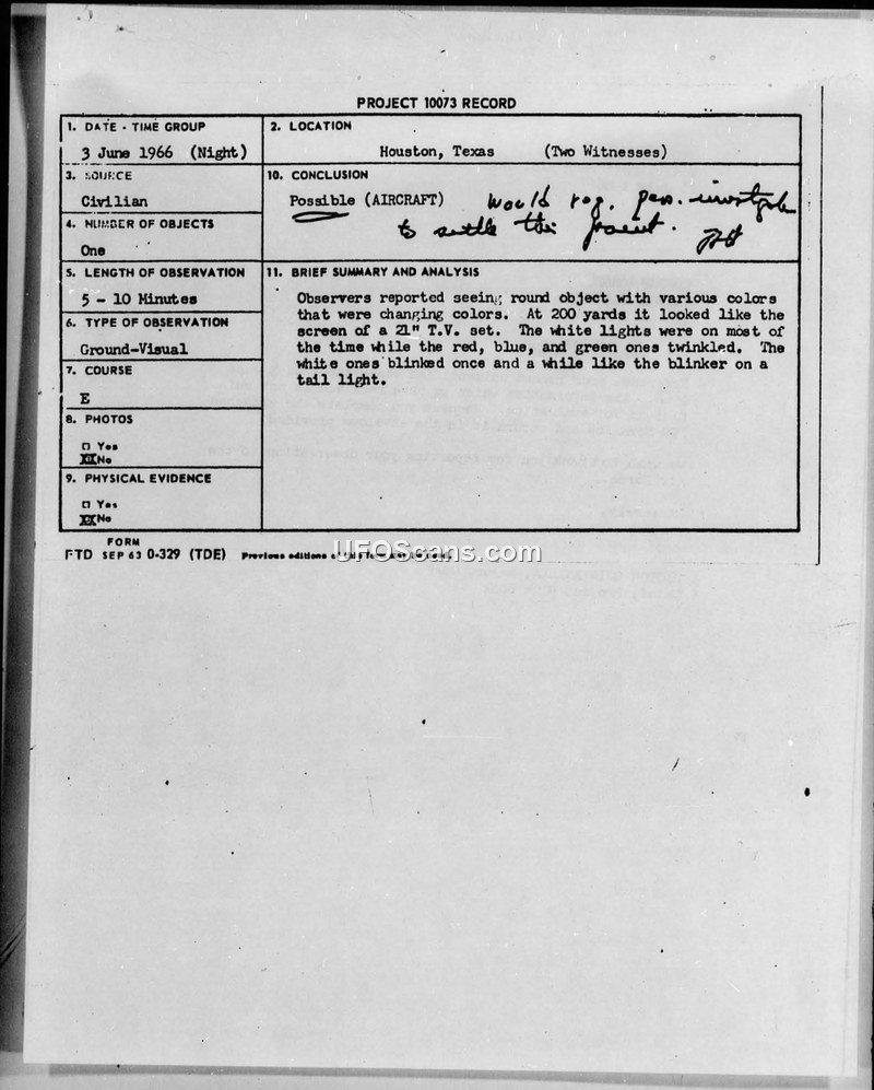 Project 10073 Records — Houston, Texas Sightings (June 1966)