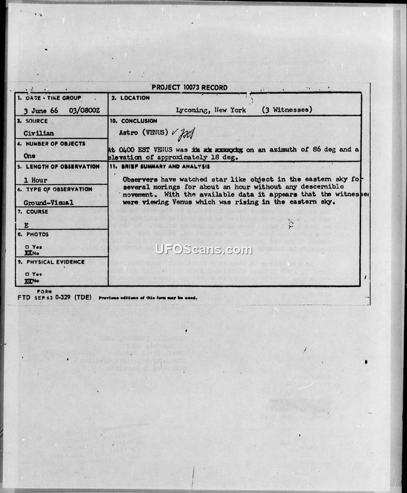 The USAF identified a civilian's June 1966 sighting of a star-like object as the planet Venus. The agency requested more information regarding a separate April 1966 sighting of a hovering object.
