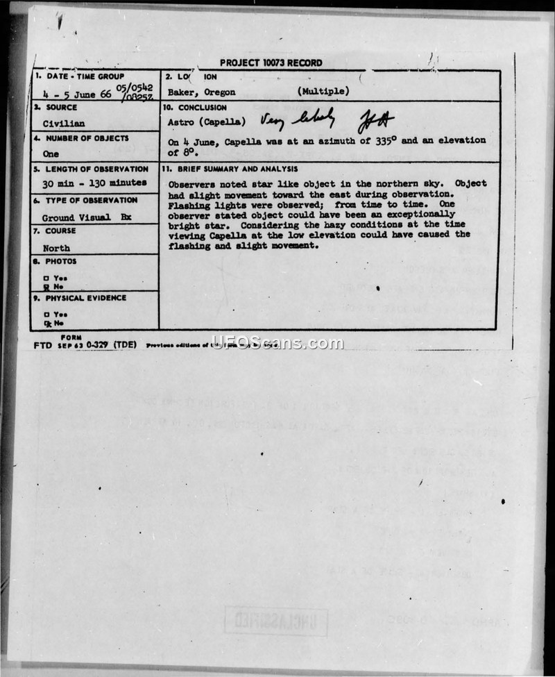 A June 1966 UFO sighting in Baker, Oregon, involving multiple military and civilian witnesses and radar contact, was officially attributed to the star Capella viewed through atmospheric haze.