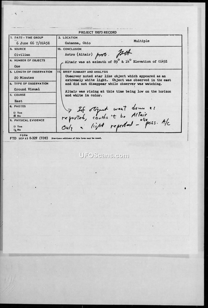 A civilian report of a star-like object in Gahanna, Ohio, on June 6, 1966, was investigated by the U.S. Air Force. The object was officially identified as the star Altair, with potential confusion caused by local civil aircraft traffic.