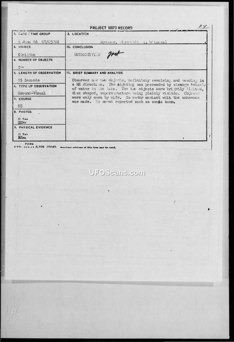 Project 10073 Record: UFO Observation, Spooner, Wisconsin, 6 June 1966