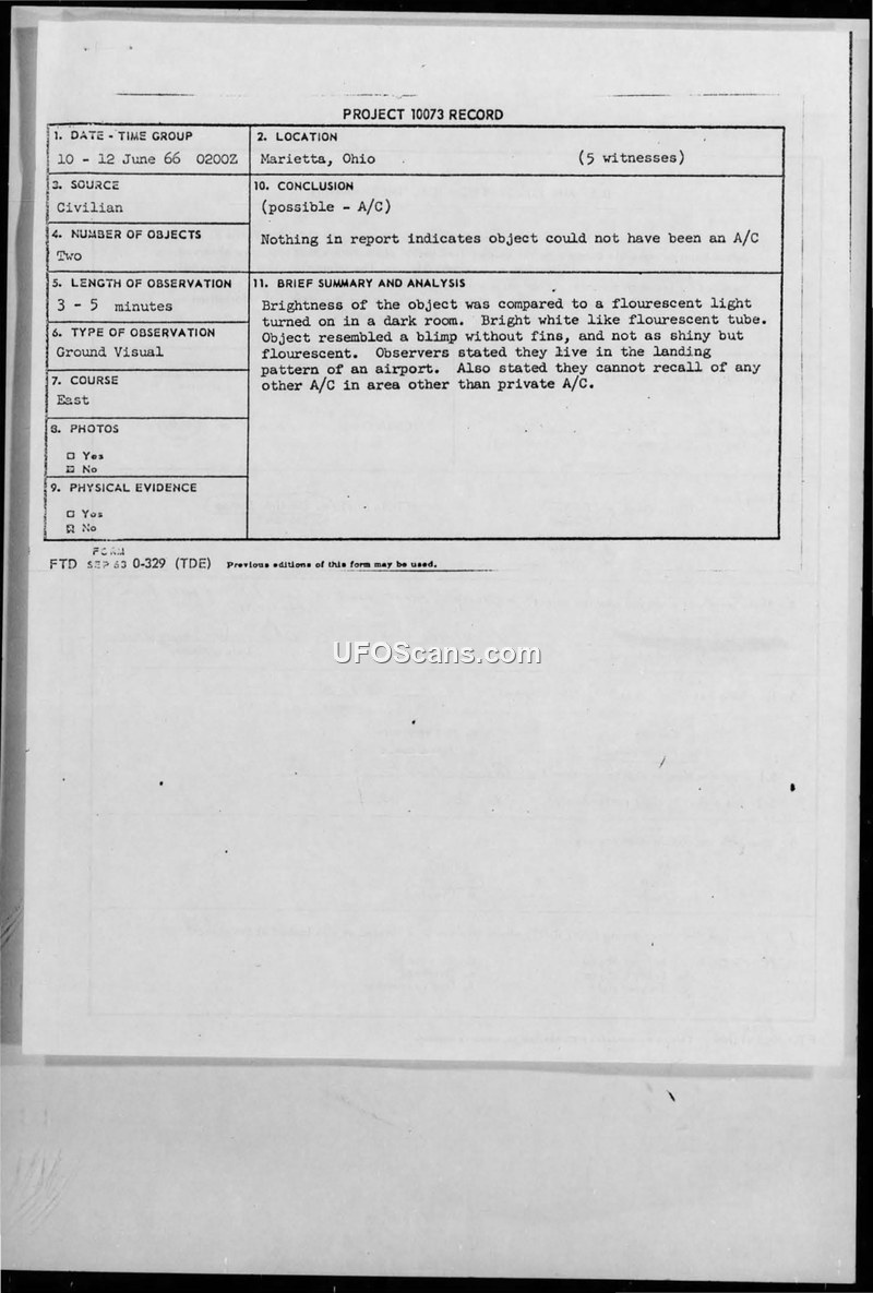 This document contains a Project 10073 record regarding a series of sightings reported by a witness in Marietta, Ohio, between June 10 and June 12, 1966. The witness, an Air Force veteran with a lifelong interest in aviation, reported observing two objects that appeared as bright white lights, resembling fluorescent tubes, and shaped like blimps without fins. The witness noted that the objects made no sound and moved in a straight line before disappearing over the horizon. The witness emphasized their familiarity with local air traffic, as they lived in the landing pattern of the Wood County (West Virginia) Airport, and stated that these objects did not behave like the conventional aircraft or satellites they were accustomed to seeing. The witness also mentioned having a poor photograph of the objects taken on June 11, 1966. Following the initial report, Major Hector Quintanilla, Jr., Chief of Project Blue Book, sent a letter to the witness on August 2, 1966, requesting further information via a formal FTD Form 164, as the initial report was deemed insufficient for evaluation. The witness subsequently completed the questionnaire. The final assessment by Captain James D. Ballsmith of the USAF concluded that the investigation revealed both military and civil aircraft were in the vicinity during the time of the sightings. Based on this, the official conclusion was that the objects were indeed aircraft, and the report was closed with no further action.
