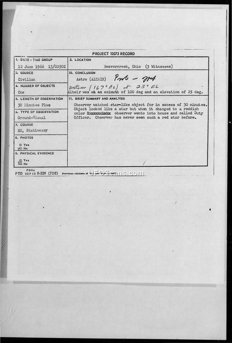 A 1966 sighting in Beavercreek, Ohio, was investigated by Project Blue Book and officially identified as the star Altair. The report includes standard technical information sheets and correspondence regarding the evaluation process.