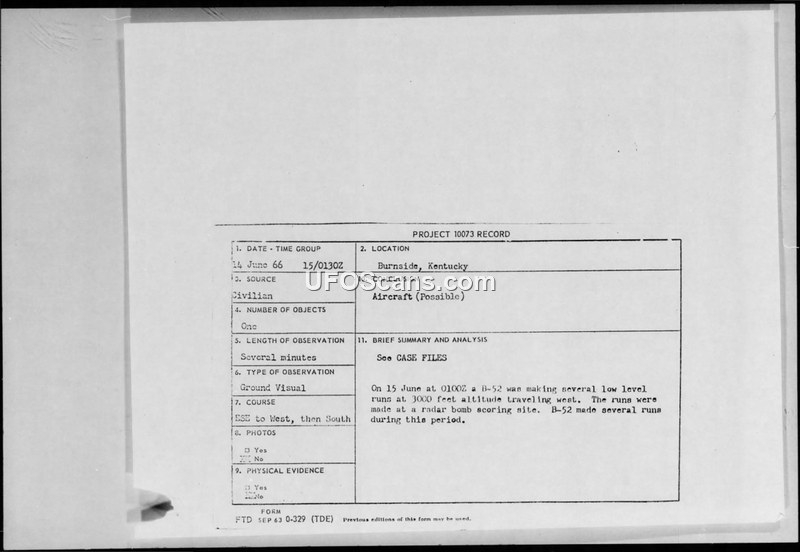 A civilian reported a UFO sighting in Burnside, Kentucky, in June 1966. Military records identified the object as a B-52 aircraft conducting low-level training runs.