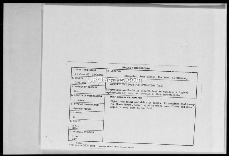 A civilian reported a stationary white, round object over Bluepoint, New York, on June 15, 1966. The Air Force concluded there was insufficient data to investigate further.