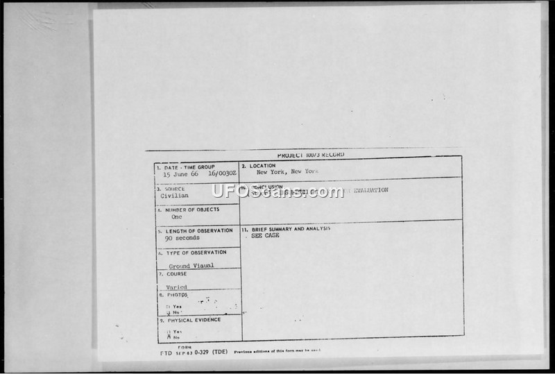 Project 100/3 Record: Sighting Report, New York, 15 June 1966