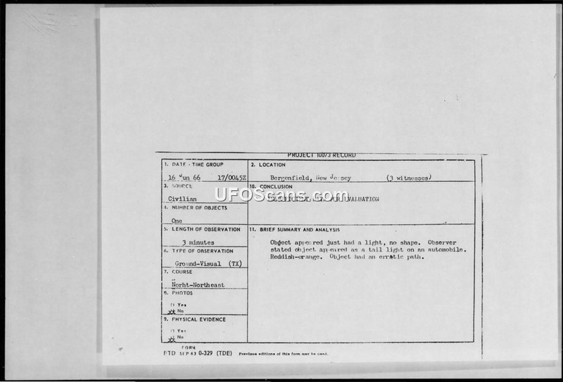 Project 10073 Record — Bergenfield, New Jersey, 16 June 1966