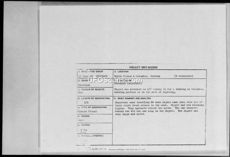 On June 17, 1966, a married couple traveling northwest from North Vernon, Indiana, reported a series of unidentified aerial observations. While driving on Route 7 and later U.S. 31, the witnesses observed brilliant crimson red flashes of light, followed by the appearance of six craft. The witnesses described these craft as having a solid appearance, featuring a wing with lighted windows and a high, perpendicular tail resembling a scorpion's tail. The objects were reported to fly in a precise, silent formation, eventually forming an inverted 'Z' shape. Later, the witnesses observed a seventh, different craft described as a flat triangle that hovered silently near the highway. The witnesses, who had family connections to a Lt. Col. William C. Sprinkle, reported the incident to the Air Force. Major Hector Quintanilla, Jr., Chief of Project Blue Book, responded to the witnesses on July 6, 1966, requesting further information via FTD Form 164, as the initial report was deemed insufficient for evaluation. The official Project 10073 record concludes that the objects were likely aircraft in a landing pattern at Columbus.