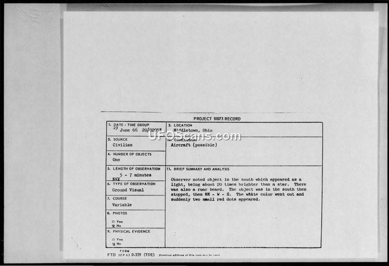 Project 10073 Record — Middletown, Ohio, 9 June 1966