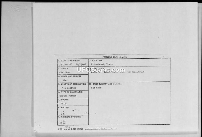 Project Blue Book Sighting Report — Friendwood, Texas, 19 June 1966