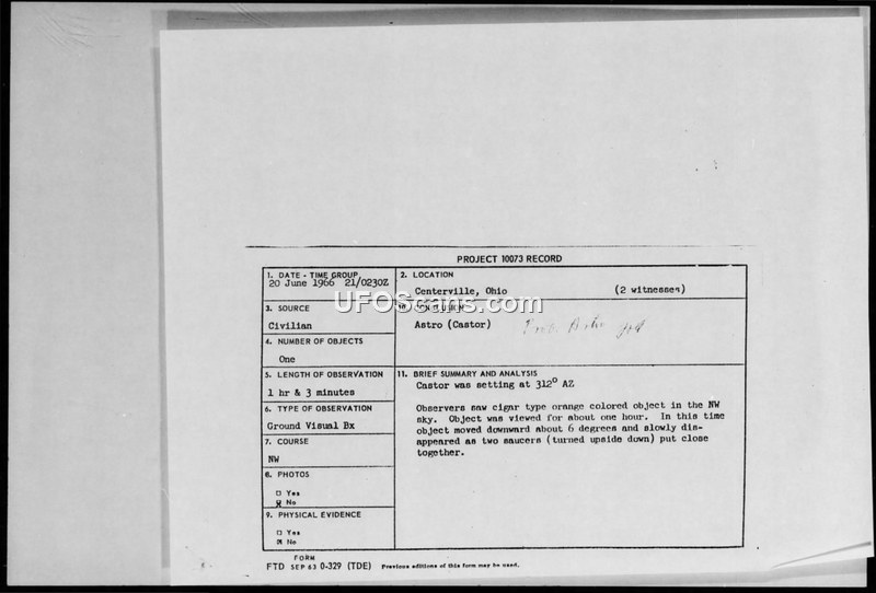A civilian reported an orange, cigar-shaped object in Centerville, Ohio, on 20 June 1966. The U.S. Air Force concluded the object was the star Castor.