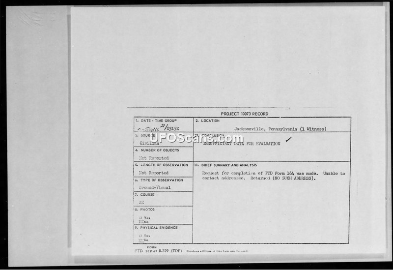 Project 10073 Record: Jacksonville, Pennsylvania Sighting