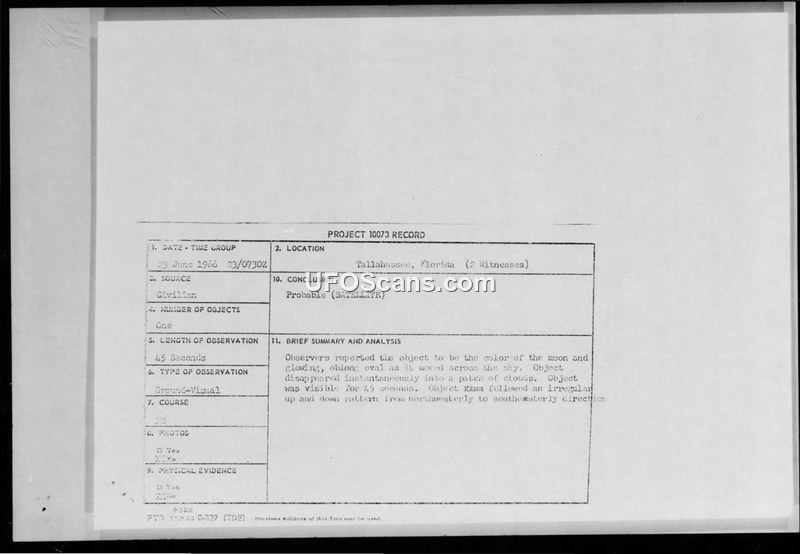 PROJECT 10073 RECORD — Tallahassee, Florida, 23 June 1966