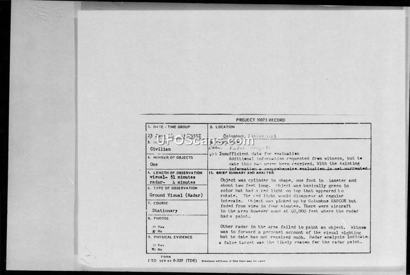 A civilian reported a stationary, cylindrical object near Columbus, Mississippi, on 23 June 1966, which was also tracked briefly by radar. The Air Force concluded the radar return was likely a false target caused by a temperature inversion.