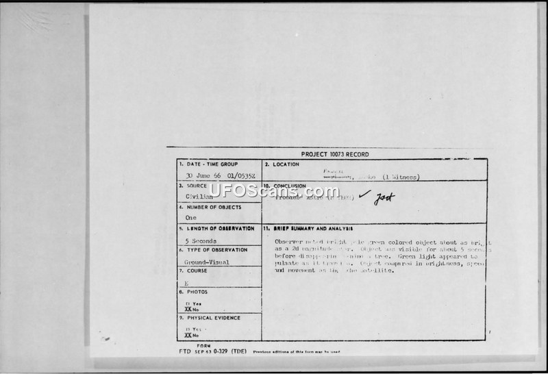 This document collection comprises a series of official correspondence, sighting reports, and internal memoranda related to Project Blue Book, the United States Air Force's investigation into Unidentified Flying Objects (UFOs) during the mid-1960s. The records span from 1966 to 1967 and include communications between the Air Force and various civilians who reported sightings or submitted photographic evidence. A recurring theme in the correspondence is the Air Force's standard procedure for handling these reports: acknowledging receipt, noting that the provided information is insufficient for a comprehensive evaluation, and requesting that the observer complete FTD Form 164 to facilitate a formal investigation. The Air Force maintained a skeptical stance, explicitly stating in several letters that they had found no tangible evidence of extraterrestrial life and that UFOs were generally misinterpretations of natural phenomena or conventional objects. The collection includes specific case files, such as reports from the Philippines involving photographic analysis, and correspondence from individuals in the United States and abroad. The photographic analysis reports, specifically Report No. 65-44, detail the technical examination of images submitted by a civilian, concluding that the imagery was likely created through multiple exposures or other photographic techniques rather than capturing actual aerial phenomena. The documents also highlight the administrative burden of the project, with officials noting the high volume of inquiries and the necessity of standardizing responses. The correspondence reflects the Air Force's efforts to manage public interest while maintaining a scientific, albeit dismissive, approach to the reports, often citing the lack of essential data—such as maneuvers, flight characteristics, and duration—as the primary reason for their inability to provide definitive explanations.