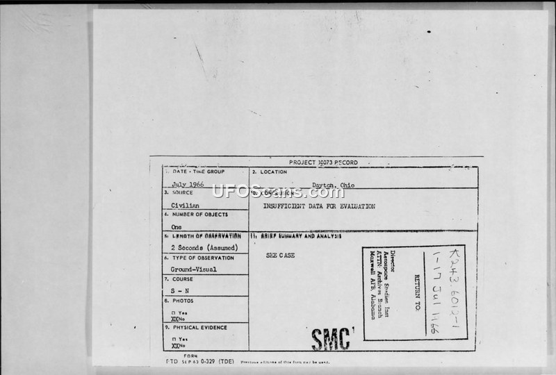 Project 10073 Records - Dayton, Ohio Sightings (July 1966)
