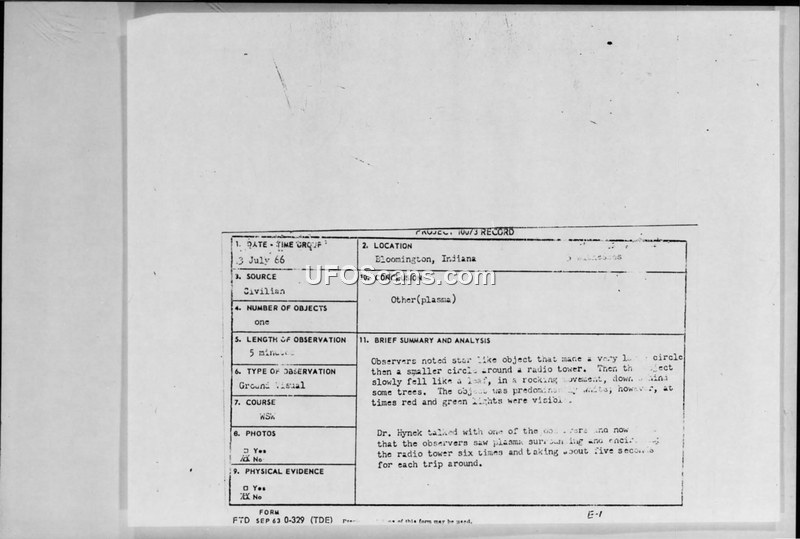 A civilian witness in Bloomington, Indiana, reported a silent, star-like object circling a radio tower on July 3, 1966. The Air Force investigation, involving Dr. Hynek, classified the event as 'Other (plasma).'