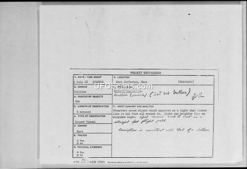 On July 3, 1966, at 0605Z, a civilian witness in West Jefferson, Ohio, observed a single, round, unidentified aerial object for a duration of four minutes. The witness described the object as a light that appeared to have fire all around it, noting that it was brighter than an airplane light. The object moved in an eastward direction along a straight flight path. The witness reported that the object made no sound and was observed through a window. The witness explicitly stated that the object moved in front of clouds. The official Air Force record for Project 10073 concludes that the object was likely a balloon, specifically a hot air balloon. An investigator's note appended to the file suggests that the sighting could not be associated with known air traffic and posits that the phenomenon was likely unannounced, unauthorized fireworks associated with the holiday weekend.