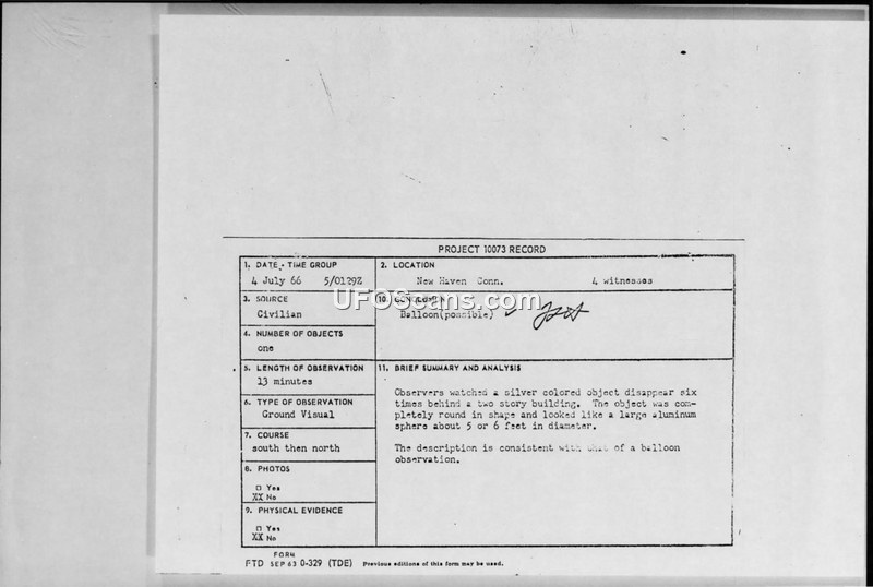 Project 10073 Record: Sighting in New Haven, Conn., 4 July 1966