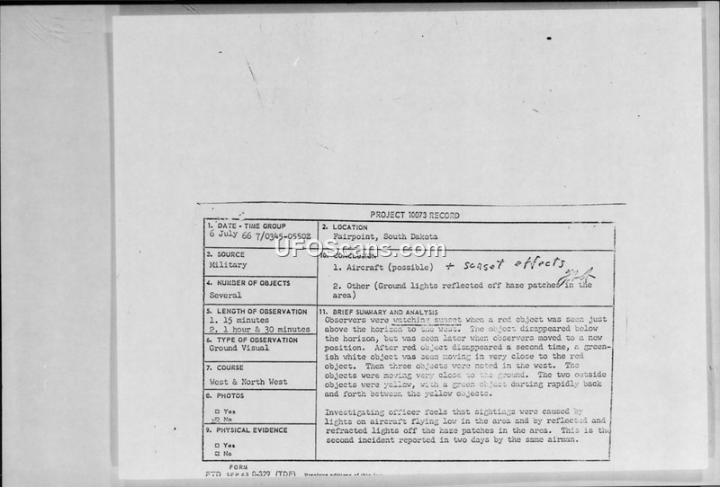 Two Air Force security policemen reported multiple unidentified aerial objects near Fairpoint, South Dakota, in July 1966. The Air Force concluded the sightings were misidentifications of low-flying aircraft and atmospheric reflections.