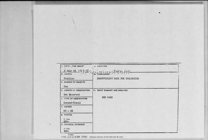 A civilian reported observing two silent, blinking, whitish-green objects moving rapidly over Oxford, Ohio, on July 6, 1966. The Air Force classified the case as having insufficient data for evaluation and requested further information from the witness.