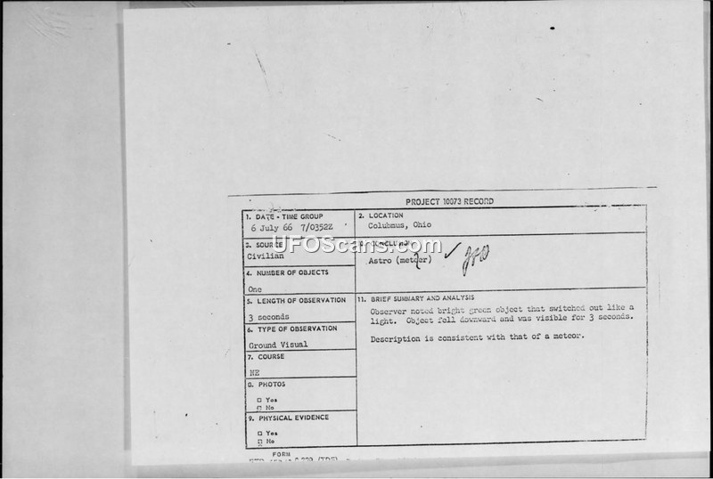 This document contains a compilation of Project 10073 records regarding unidentified aerial phenomena reported in Columbus, Ohio, during July 1966. The reports detail multiple sightings by civilian witnesses near the University Airport, also known as Don Scott Field. The sightings occurred on 6, 10, and 11 July 1966. Witnesses described various objects, including a bright green object that appeared to switch off like a light, and other objects described as solid, appearing as lights, and moving in circular patterns. Some witnesses reported sounds resembling a 'put-put' engine or high-pitched noises. The reports include technical information questionnaires completed by the witnesses, detailing their observations, weather conditions, and the appearance of the objects. The investigating officer, Capt. Jordan, evaluated these reports and concluded that the sightings were consistent with either meteors or aircraft. Specifically, the proximity of the sightings to the University Airport, which is heavily used by both the Army Guard and civilian pilots, led to the conclusion that the observed phenomena were likely aircraft, possibly with position lights on their wing tips. The documentation includes weather data and wind reports for the relevant dates to assist in the analysis of the sightings.