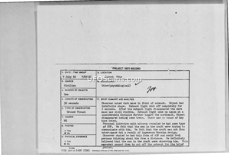 Project 10073 Record — Sighting Report, Girard, Ohio, July 1966