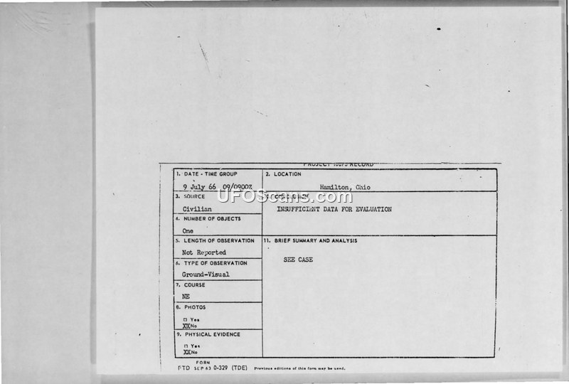 Project Blue Book Sighting Report — Hamilton, Ohio, 9 July 1966
