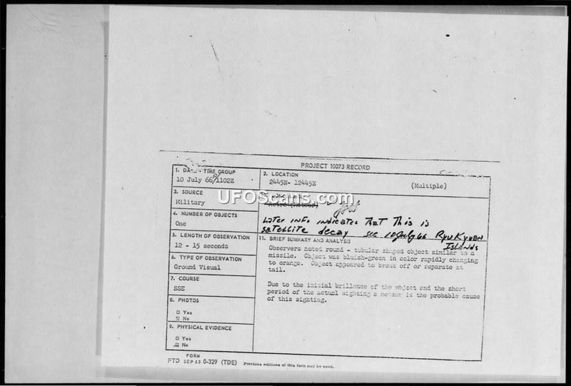 A sighting of a tubular object in the Ryukyu Islands on 10 July 1966 was initially reported as a meteor but later identified as satellite decay.