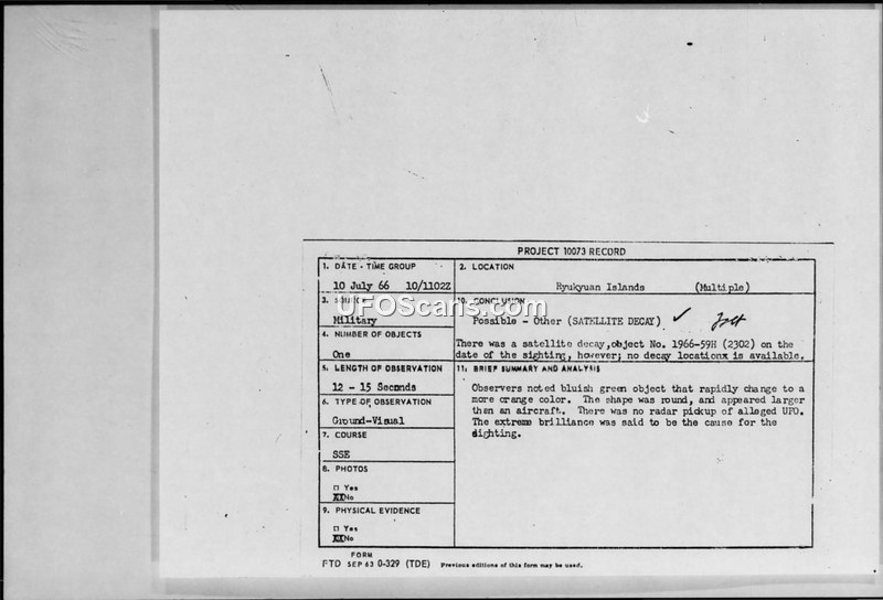 Project 10073 Record: Sighting Report 10 July 1966, Ryukyuan Islands