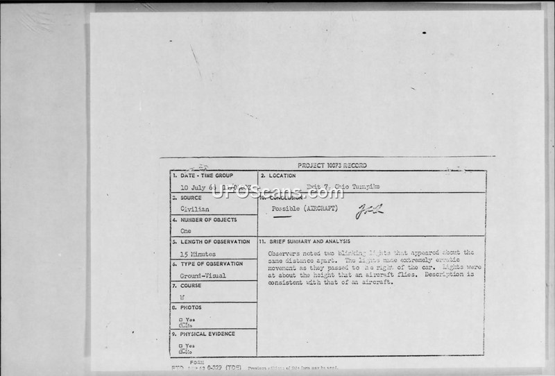 A sighting report from 10 July 1966 involving two witnesses who observed two erratic, blinking lights while driving on the Ohio Turnpike. The official conclusion categorized the event as a possible aircraft.