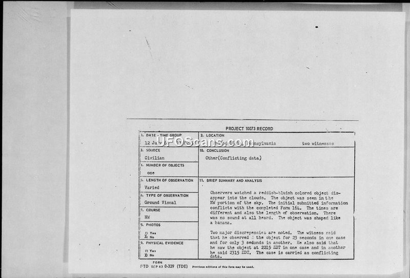 This document contains a UAP sighting report from a civilian witness in Philadelphia, Pennsylvania, dated July 12, 1966. The witness, a 13-year-old male, reported observing a single, solid, banana-shaped object that was reddish-bluish in color. The object was seen in the northwest portion of the sky at approximately 10:15 P.M. EDT. The witness estimated the object's speed at 40 M.P.H. and its distance at 1,000 feet. The observation lasted for 23 seconds before the object disappeared into the clouds. The witness reported no sound and noted that the object changed brightness. The Air Force's Foreign Technology Division (FTD) reviewed the report and determined that the information was insufficient for a scientific evaluation. A letter from Colonel James C. Manatt, dated January 30, 1967, requested that the witness complete an FTD Form 164 for further analysis. The final Project 10073 record classifies the case as 'Other (Conflicting data)' because the witness provided inconsistent information regarding the duration of the sighting and the specific time of the event in different sections of the documentation.