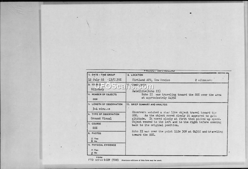 Project Blue Book Record: Sighting at Kirtland AFB, 12 July 1966