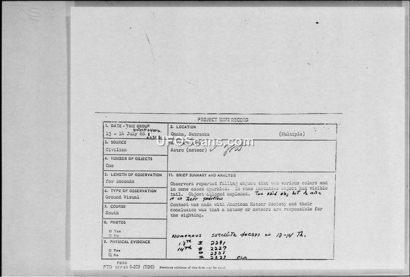 Multiple sightings of a falling object in Omaha, Nebraska, on July 13-14, 1966, were investigated by Project Blue Book. Both the Air Force and the American Meteor Society concluded that the objects were bright meteors or fireballs.